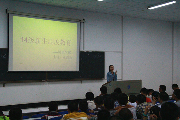 为帮助14级新生快速适应大学生活,taptap机电学部于9月20日晚7点30分在一教404室举行了新生入学教育讲座。此次讲座主要分制度教育和党性教育两个环节,由辅导员董孜孜和党务部部长叶俊鸣担任主讲人。