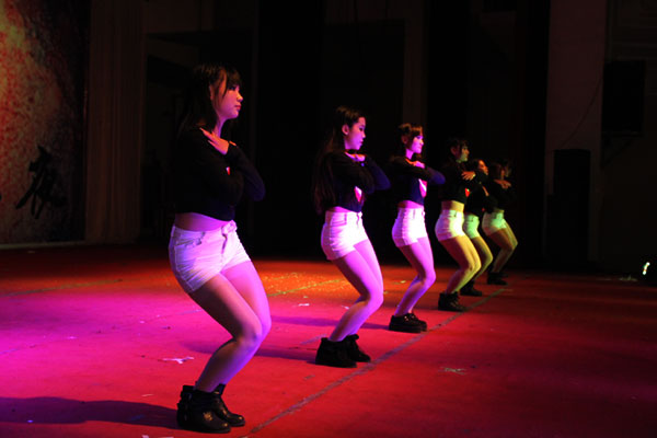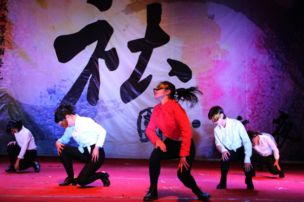金色的面具,动感的节奏,飘逸的长发,taptap女生部啦啦队的舞蹈《1234》掀起了晚会的第一个高潮,他们时而可爱时而性感的舞蹈让台下观众大呼过瘾。红色卫衣,白色面具,化学俱乐部的9个率性小伙全身迸发着年轻的活力,一支《Hip Hop Show》high翻全场,更加难得是现代舞蹈中融入了古筝乐曲、京剧等古典元素,将古典与现代融合得恰到好处。