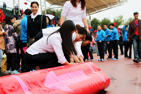 作为教职工大赛的重头戏,“滚滚向前”压轴进行。每支队伍需要用充气滚轴承载着气垫交替前进。赛前所有队伍热火朝天讨论着战术,力求用最短的时间冲过终点,“三根滚轴就够了,要速度快。”“我看三根不够稳啊,你在旁边要扶稳一点。”外国语学院代表队杨晴老师坐在气垫上,在比赛中常被队友们传递的滚轴撞倒头,于是她索性侧卧下来,“我们降低了高度,这样滚轴的传递就会更快一些,队伍也走得更稳些。”