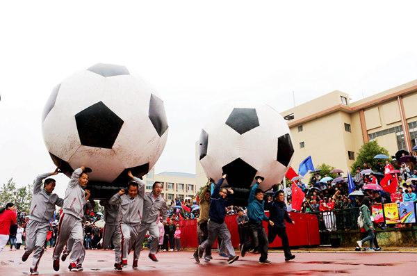 一声紧促的哨声响起,六人一组的老师们纷纷扛着直径约2米的乾坤球飞奔出去,赛道上老师们顾不上形象,跑急了手要松了就狠命的抓着球的托盘,有身高差的就用头顶着维持平衡,臂力强的就靠手臂支撑着。伴着周围火爆的加油声,乾坤球稳稳递到跑到另一边的六人手中,由他们托球奔到终点。“我们担心站在后面的老师在跑动的时候迈不开步子,就让他们自己调整位置。”后面的老师行进时迅速移到两边,原本椭圆的队形变为人字形,老师们顾不上被雨淋湿道具蹭脏衣服,抓起把手就猛地冲刺。抵达终点时随着惯性松手,将乾坤球抛出。