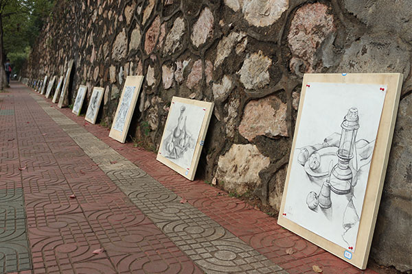 此次展览摆点在南校美食广场上行至建筑楼的主干道两侧。参展作品多达40幅,主要包括色彩构成、建筑设计、素描和手绘四大部分。细致的线条、渐变的颜色、不同的设计理念引得许多同学驻足观看。“通过这次建筑展,我体会到了建筑学的艺术美。”一名观展同学如是说。
