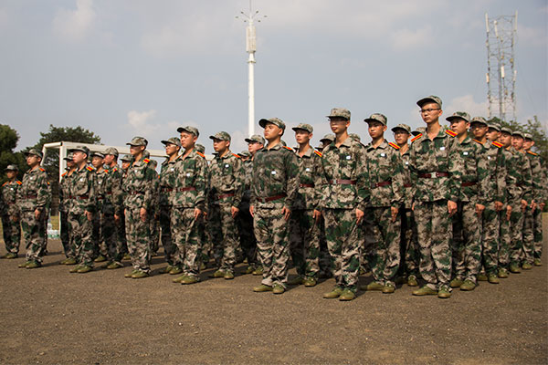 军姿训练是每天的必备过程,新生们从刚开始的10分钟到能坚持40分钟或是更长的时间,这个过程靠的就是新生们的坚毅品质。站军姿,坚持的时间越来越长,也许新生浑然不知,但这些变化却被收入教官眼底,记录在助班心底。