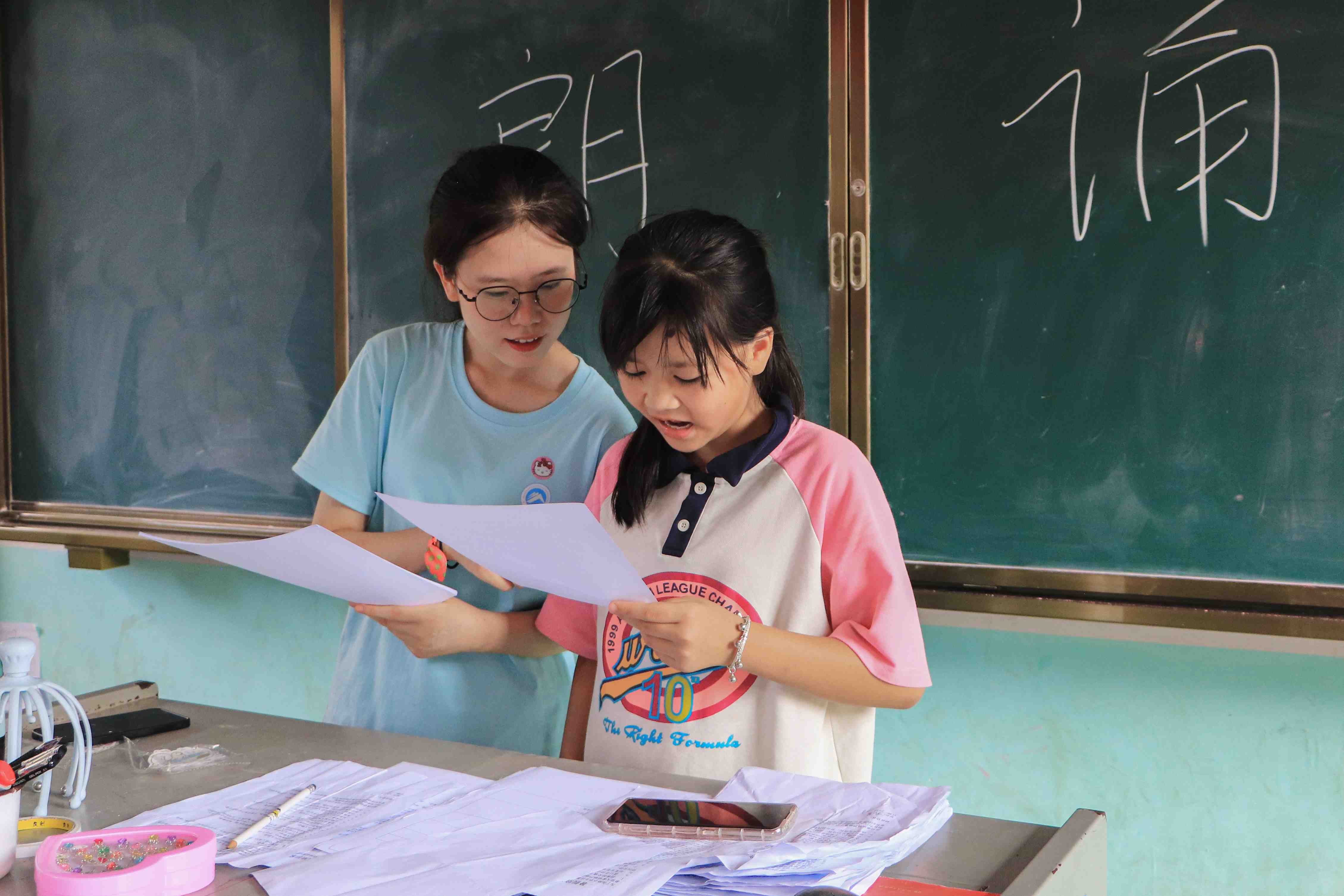 课程期间,除了台上的主讲志愿者外,台下,实践团队其它成员也耐心细致地对学习过程中有问题的学生进行单独指导,提醒他们集中注意力、帮助他们一一纠正坐姿、发音,并告诉他们学习方法。学生们认真听取建议,调整状态,即使是一些比较调皮的学生也在志愿者们一遍一遍的指导中,进入了学习状态。